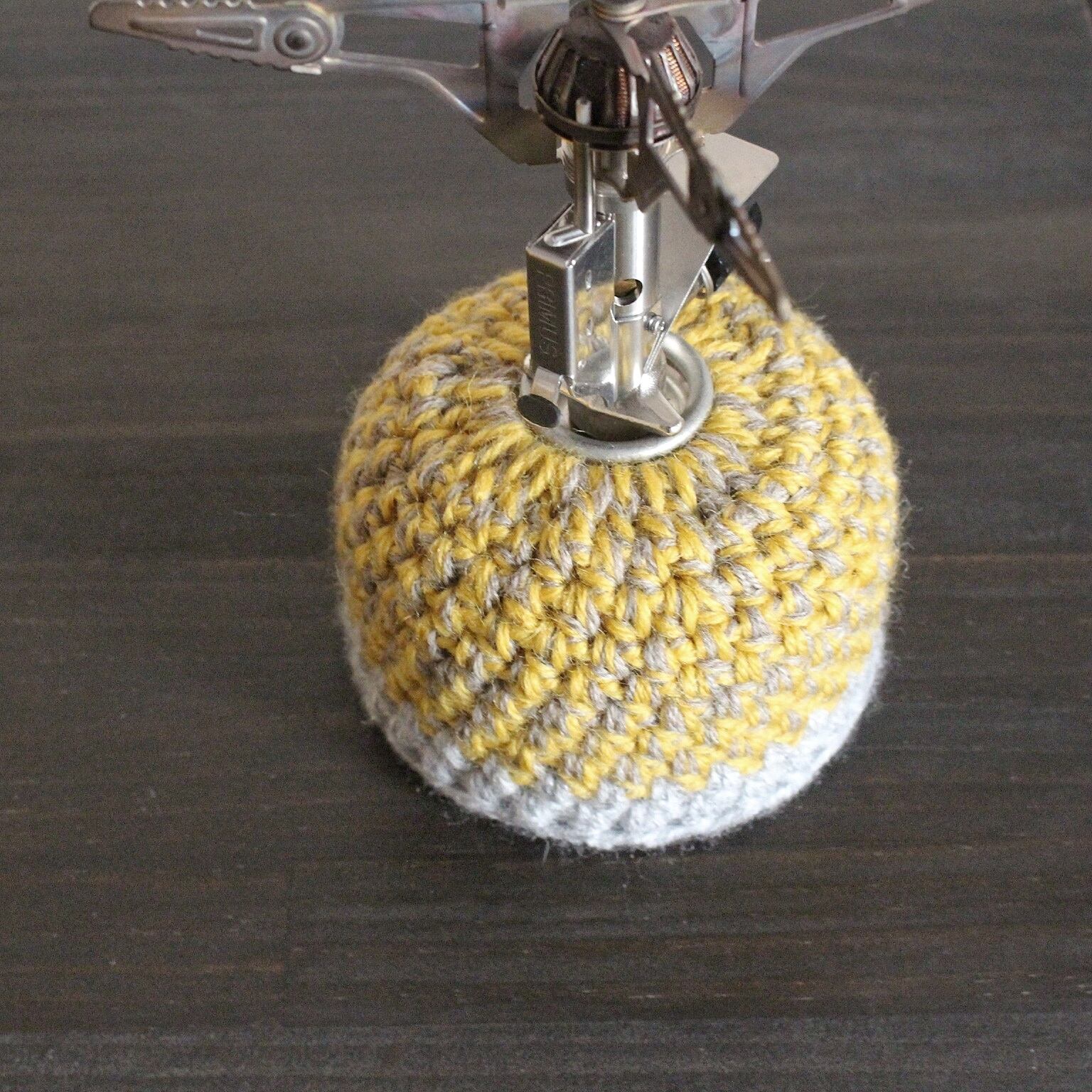 手編みのガス缶カバーでキャンプや山登りの山ごはんに彩りを